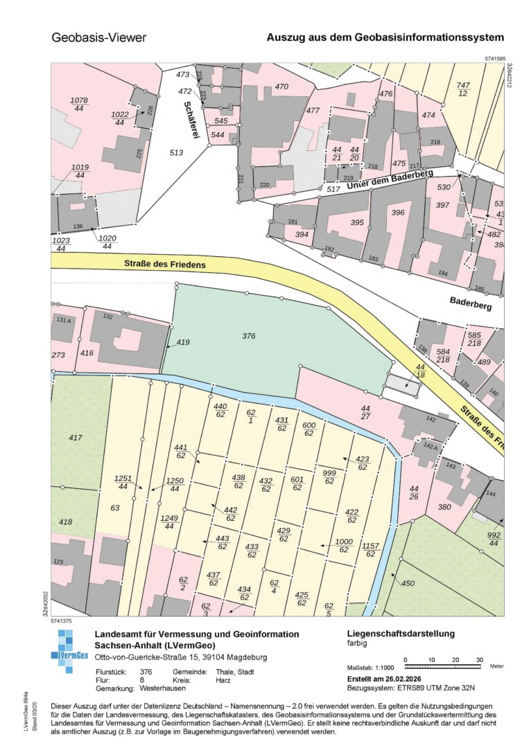 Das Verkaufsgrundstück befindet sich in direkter Ortsmitte von Westerhausen. Es hat einen unregelmäßigen Zuschnitt. Die Erschließung ist von der Straße des Friedens abgesichert. Geplant war einmal, dieses Grundstück mit 6 Doppelhaushälften zu bebauen. Eine entsprechende Genehmigung wurde damals erteilt.